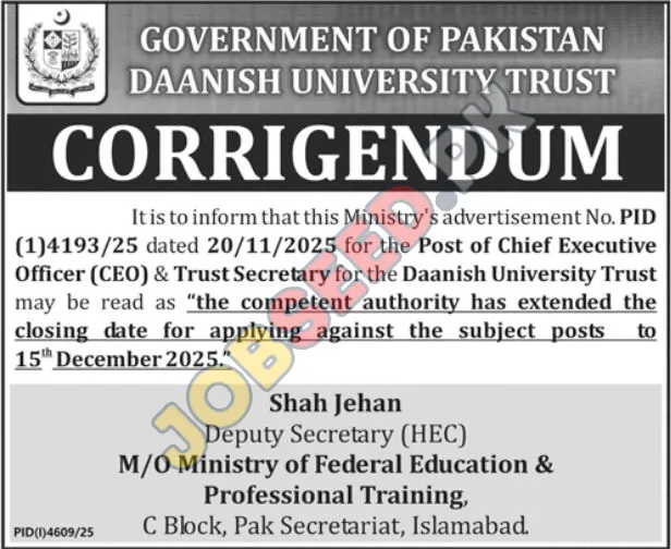 The Daanish University Trust has announced an extension to the application deadline for the positions of Chief Executive Officer (CEO) and Trust Secretary. This is a crucial opportunity to join a leading educational institution in Pakistan. If you possess the necessary qualifications and experience, we encourage you to apply before the extended deadline.