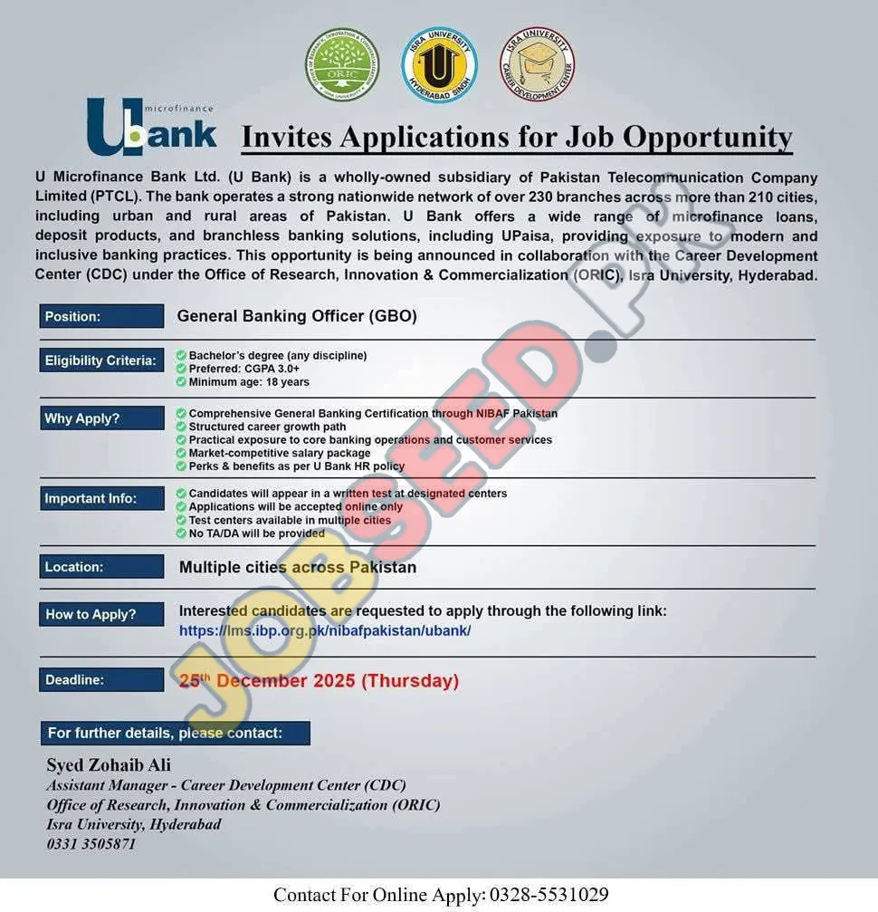 Apply at U Microfinance Bank Ltd. (U Bank), latest jobs in Banking department before closing date which is around 07 January, 2026 or as per closing date in newspaper ad. Read complete ad online to know how to apply on latest U Microfinance Bank Ltd. (U Bank) job opportunities. For Further details visit https://www.jobseed.pk.