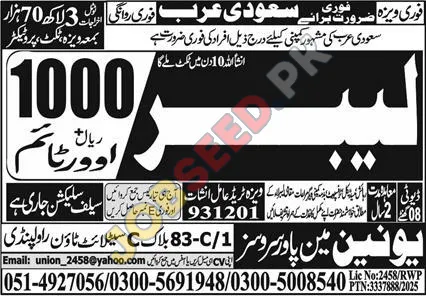 Join the team at Union Manpower Services in Dammam Saudi Arabia. They are seeking to hire a Union Manpower Services. This is a Full-Time position. This career opportunity was advertised on 17 December, 2025 in Express Newspaper. The last date to apply is 24 December, 2025. Don't miss this chance to advance your career with Union Manpower Services. For more information and to apply online, visit https://www.jobseed.pk.