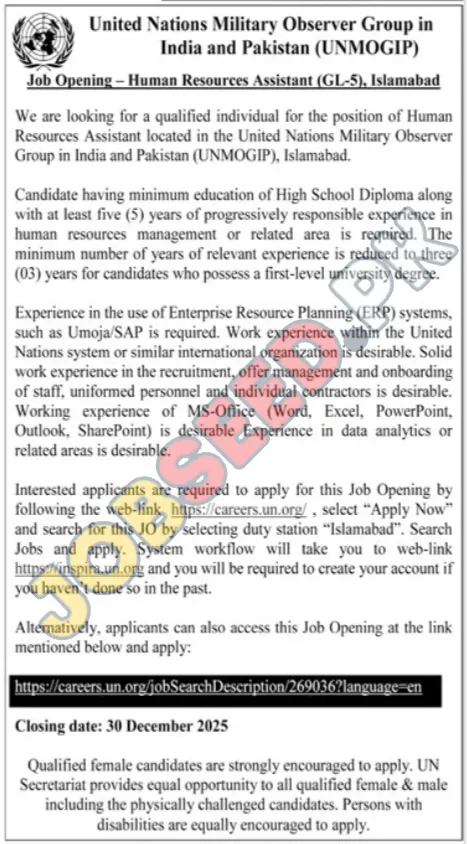 United Nations Military Observer Group in India & Pakistan, Islamabad Islamabad Pakistan invites applications from eligible candidates for the post of Human Resources Assistant as per advertisement of 14 December, 2025, published in Jang Newspaper. Diploma educational qualification will be preferred.