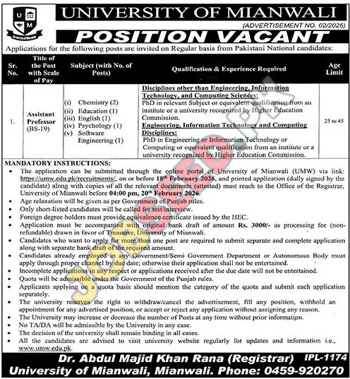 - 📅 Ensure your application and documents reach the Office of the Registrar, University of Mianwali by 04:00 PM on February 20th, 2026.
