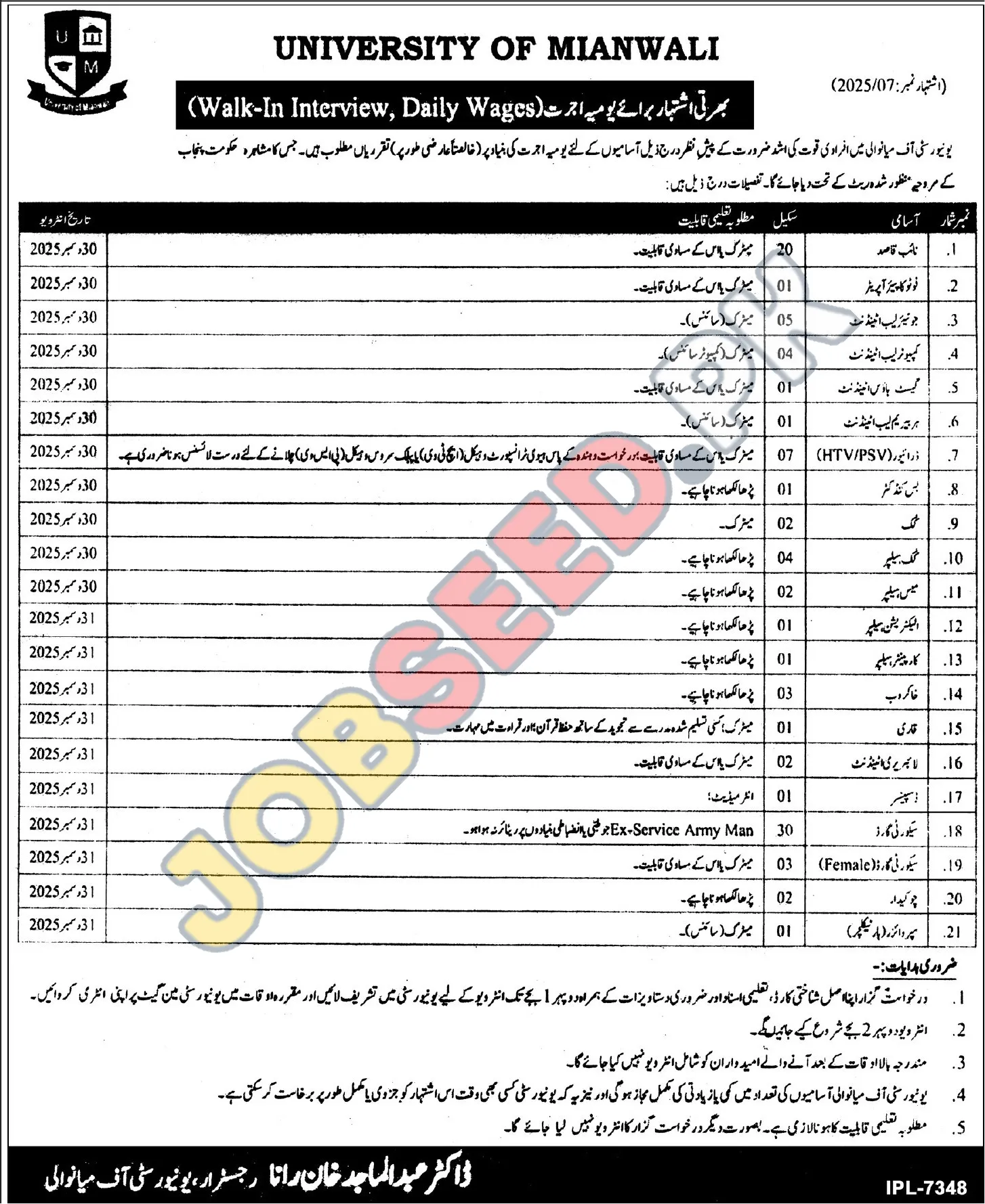 Apply at University of Mianwali, latest jobs in Education department before closing date which is around 29 December, 2025 or as per closing date in newspaper ad. Read complete ad online to know how to apply on latest University of Mianwali job opportunities. For Further details visit https://www.jobseed.pk.