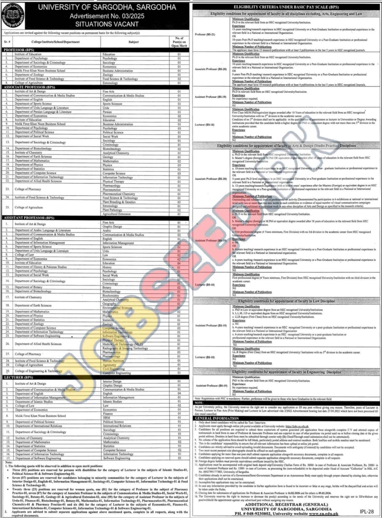 The University of Sargodha, a prominent public sector institution, has announced significant career opportunities for academic positions in 2025. This latest hiring drive seeks highly qualified and experienced faculty members for various departments. The vacancies are available for Professor (BPS-21), Associate Professor (BPS-20), Assistant Professor (BPS-19), and Lecturer (BPS-18) roles. These government jobs offer excellent prospects for professional growth and research development in a dynamic academic environment.