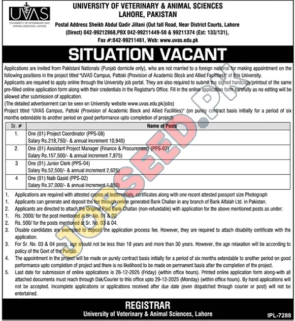 University of Veterinary and Animal Sciences UVAS, Lahore Punjab Pakistan invites applications from eligible candidates for the post of Project Coordinator, Assistant Project Manager, Junior Clerk and Naib Qasid as per advertisement of 13 December, 2025, published in Dunya Newspaper. Master, Matric, Literate educational qualification will be preferred.