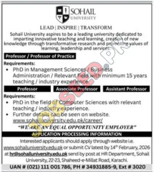 Sohail University, a dynamic private sector university, is searching for dedicated Professors and Associate Professors to enhance its faculty. These positions offer a chance to engage in pioneering teaching and research practices, contributing to the creation of new knowledge and the advancement of learning.