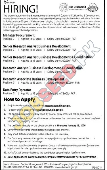 Urban Unit, Lahore invites applications from eligible candidates for the post of Manager Procurement, Senior Research Analyst Business Development, Senior Research Analyst Business Development & Coordination, Research Analyst Business Development & Coordination, Research Associate Business Development and Data Entry Operator as per advertisement of 28 December, 2025. Bachelor, Master, Intermediate educational qualification will be preferred.