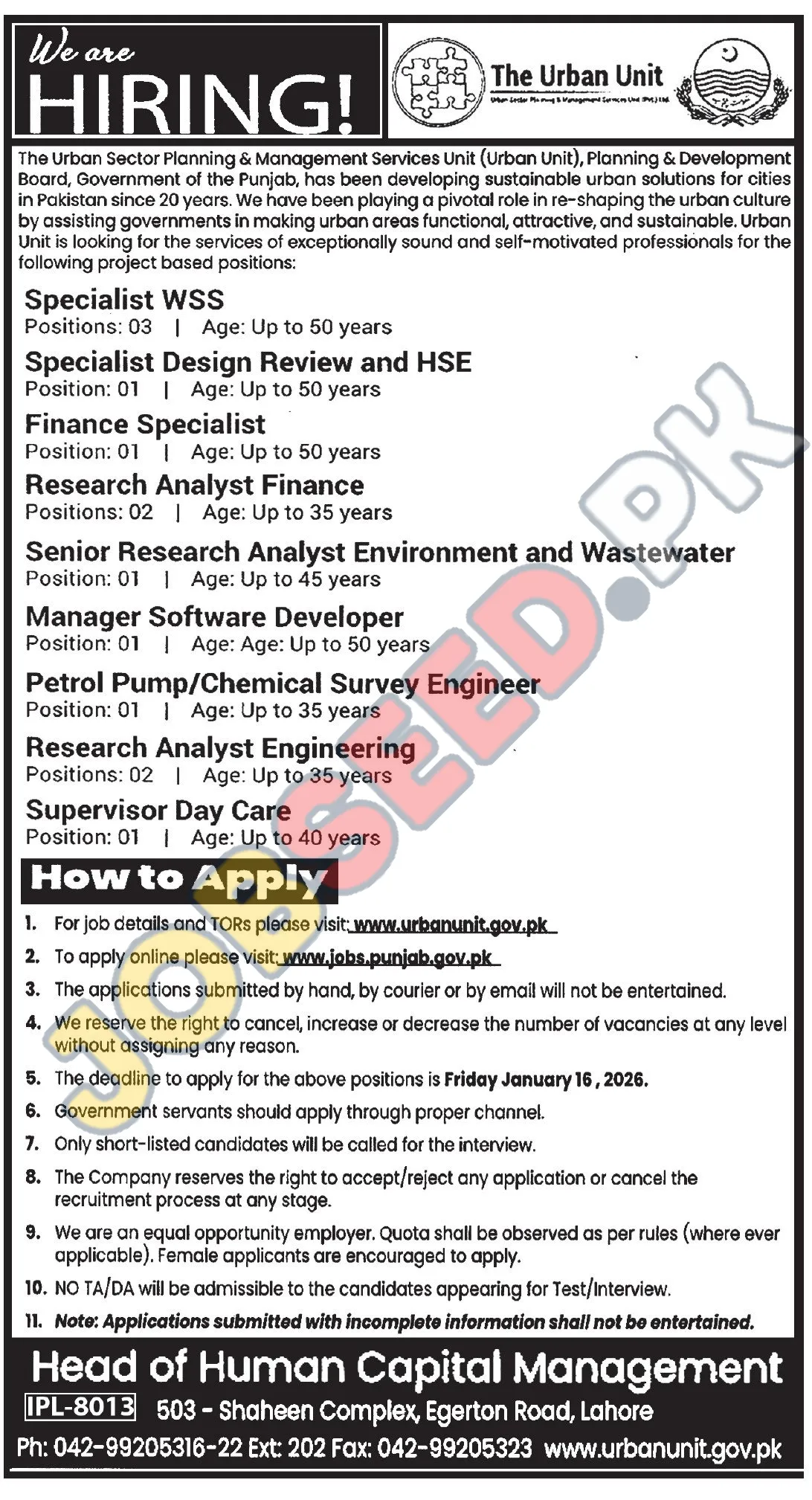 Apply at Urban Unit before closing date which is around 16 January, 2026 or as per closing date in newspaper ad. Read complete ad online to know how to apply on latest Urban Unit job opportunities. For Further details visit https://www.jobseed.pk.