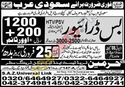Seeking qualified individuals for urgent bus driver roles in Saudi Arabia. This private sector opportunity is ideal for Pakistani drivers holding HTV/PSV licenses. The advertised monthly salary is between 2500 and 3000 SAR, plus allowances. Explore these S.A.Z. Universal Link jobs in Karachi with competitive benefits. Successful candidates will benefit from a reputable employer and potential for long-term employment. This is a significant chance for individuals seeking international driving jobs.