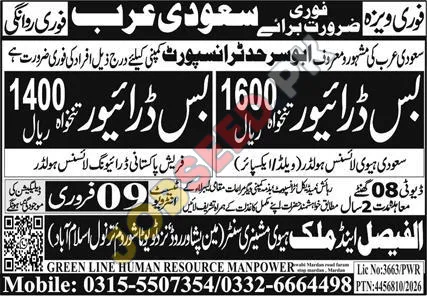 Explore immediate employment opportunities for skilled Bus Drivers in Saudi Arabia. This private sector recruitment drive by GREEN LINE HUMAN RESOURCE MANPOWER seeks experienced individuals for lucrative positions. We are offering attractive monthly salaries and a chance for professional growth in the Kingdom. Ideal candidates will possess a valid Pakistani driving license and a clean driving record. Successful candidates will benefit from these best career opportunities. This is a fantastic chance to secure a stable career abroad with excellent earning potential.