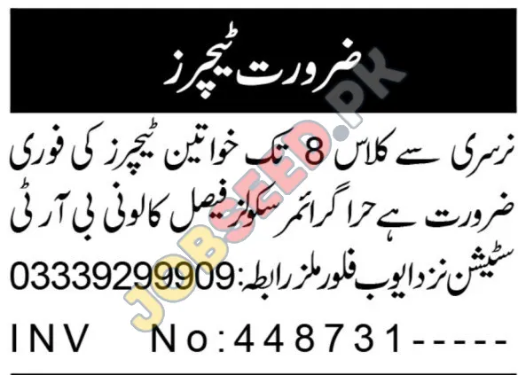 Hara Grammar School, located in Faisal Colony, Faisalabad, is urgently seeking qualified female teachers to fill immediate openings. This private educational institution is dedicated to providing quality education and is looking for passionate educators to join their team. This position represents excellent Apply for Teacher in Faisalabad in the region. The positions are open for teaching students from the Nursery level up to Class 8.