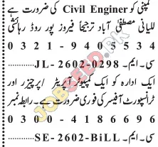 This advertisement highlights urgent career opportunities for a Civil Engineer and a Transport Officer within a Pakistani organization. The company is focused on recruiting qualified individuals to fill these critical roles, offering a chance for professional growth and development. Ideal candidates will possess the necessary technical expertise and a strong work ethic to contribute to ongoing projects. Explore diverse job openings and find your next career move in Pakistan's growing economy.