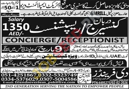 Friends Overseas is actively recruiting for talented individuals to fill critical Concierge and Receptionist positions within the United Arab Emirates. This is a significant opportunity for those looking to build a rewarding career in the hospitality sector, offering a monthly salary of 1350 AED. The company is dedicated to providing exceptional service and seeks candidates who are proactive, professional, and possess strong communication skills. This role is perfect for individuals aiming for international employment and professional development.