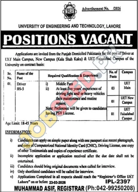 Latest Driver Vacancies at UET Lahore