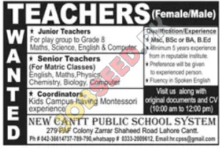 New Cantt Public School System, a prominent educational institution in Lahore, is currently expanding its faculty and seeking passionate educators to fill several key positions. This is an excellent opportunity for individuals looking to advance their careers in the education sector within a reputable private school environment. We are committed to fostering academic excellence and providing a nurturing learning atmosphere for our students.