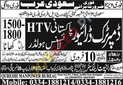 Saudi Arabia's leading companies are actively seeking experienced HTV Drivers to join their esteemed operations. This is a prime opportunity for Pakistani professionals to secure lucrative employment abroad, offering a monthly salary range of 1500-1800 Saudi Riyals. Successful candidates will benefit from a supportive work environment and potential for career advancement within the private sector. We are looking for individuals with valid HTV licenses and a proven track record in safe driving practices. Explore these exciting government-approved overseas job openings and embark on a rewarding international career.
