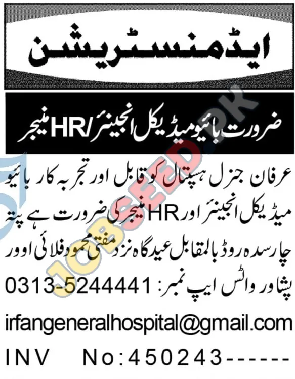 Urgent Hiring: Medical Engineer & HR Manager at Irfan General Hospital