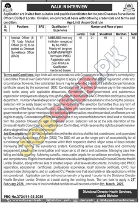 Explore exciting government job opportunities in Balochistan as a Medical Officer (Diseases Surveillance Officer - DSO) on a contractual basis. This role offers a chance to contribute to public health initiatives and gain valuable experience in outbreak response and surveillance systems. We are seeking dedicated professionals for this critical public sector employment. This position is ideal for individuals looking for a stable government career with opportunities for professional growth in the healthcare sector. Discover the latest government vacancies and career advancements in Loralai.