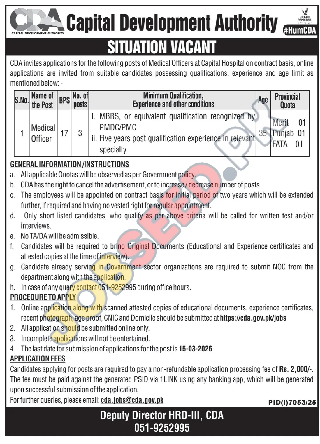Urgent Hiring: Medical Officers at Capital Development Authority - Contract Basis