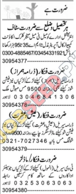 - For Drama Serial Actor (Male/Female) Role: Individuals with acting talent are encouraged to apply. Daily remuneration is 9500 PKR. Contact the given numbers for details.