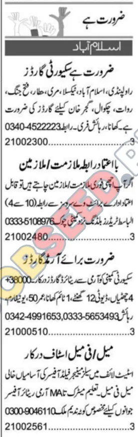 - Security Guards: Multiple vacancies available for male security personnel to serve in various locations including Rawalpindi, Islamabad, Taxila, Murree, Attock, Fateh Jang, Rawat, Chakwal, and Gujar Khan.