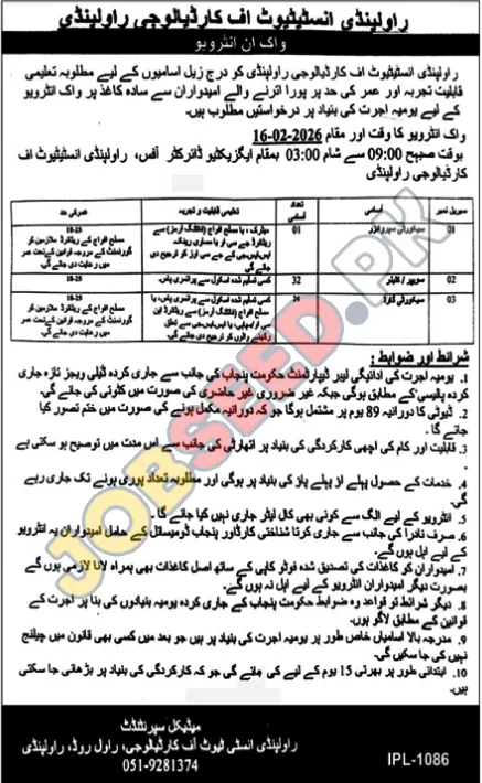 Discover exciting government job opportunities in Rawalpindi for skilled individuals seeking a stable career in the healthcare sector. The Rawalpindi Institute of Cardiology is conducting walk-in interviews for various technician roles. This is a prime chance for individuals with relevant experience and qualifications to join a reputable public sector organization and contribute to vital healthcare services. Explore these latest government vacancies and advance your professional journey. Additionally, Latest Healthcare careers are available for qualified candidates.