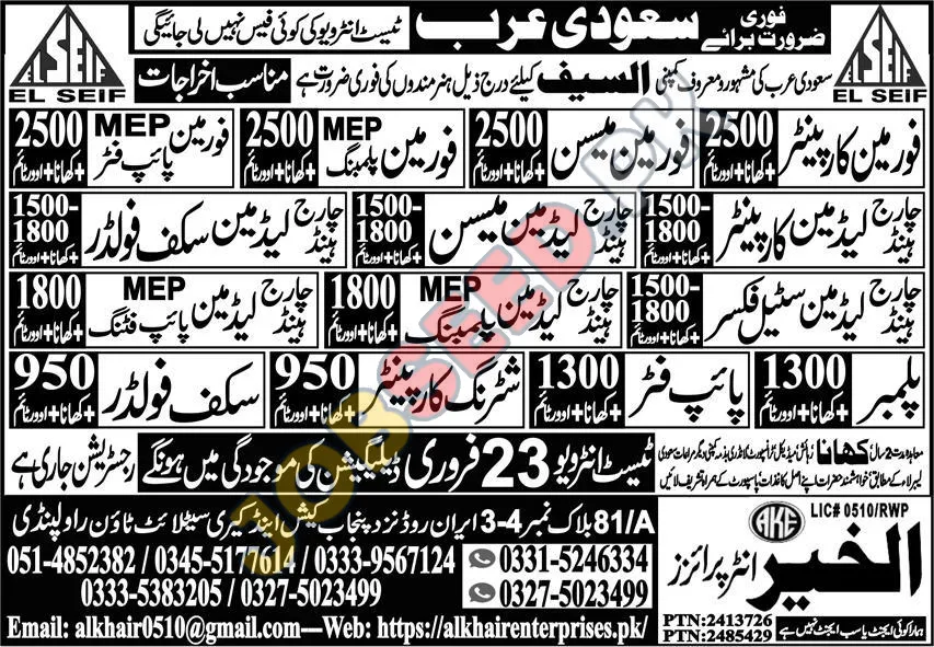 Saudi Arabia's leading construction and MEP firm, El Seif, is urgently seeking experienced professionals for various roles. This is a prime opportunity for skilled individuals to advance their careers in the Middle East. We are particularly looking for certified welders and MEP technicians with a proven track record in large-scale projects. Al Khair Enterprises, a reputable overseas employment promoter, is facilitating this recruitment drive. Secure your future with competitive salaries and benefits in a dynamic work environment. Explore these high-demand job openings and take the next step in your professional journey.