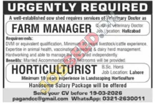 - Farm Manager: Requires a B.Sc. Additionally, job openings are available for qualified candidates. Hons with a minimum of 10 years of experience in landscaping horticulture. (Note: The advertisement seems to have a mismatch here, listing B.Sc. Hons and Landscaping Horticulture for Farm Manager, while the primary need is for a Veterinary Doctor. Assuming the Farm Manager role is related to the cow shed operations.)