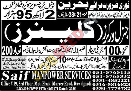 Discover exciting overseas job openings for Cleaners in Bahrain, advertised by Saif Manpower Services. This private sector recruitment drive offers a substantial monthly salary of up to 200 Bahraini Dinars for 100 general cleaner positions. Candidates with basic English proficiency and an age range of 21-38 years are encouraged to apply for this significant international employment opportunity. Explore career prospects in the Middle East with a reputable manpower agency.