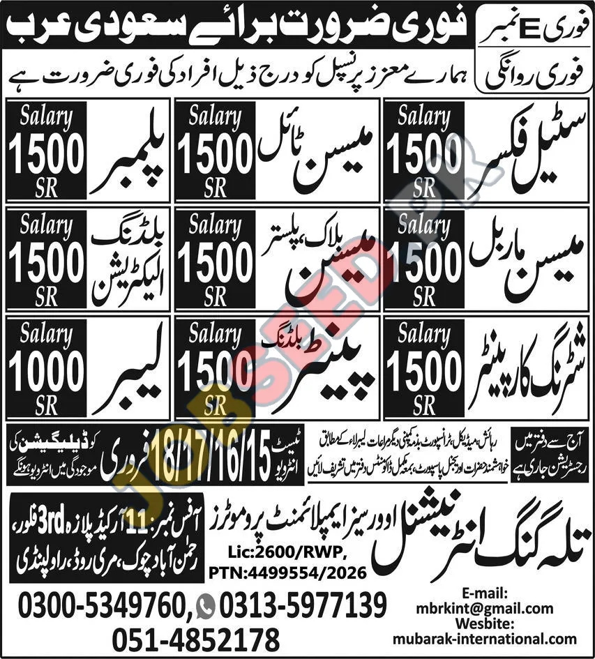 Mubarak International is actively seeking skilled individuals for immediate deployment to Saudi Arabia. This is a fantastic opportunity for Pakistani nationals looking for reputable overseas employment in the construction sector. The company is committed to providing excellent working conditions and competitive compensation for its employees.