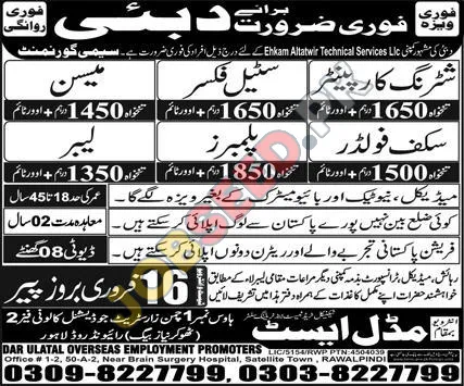 This is an excellent opportunity for skilled individuals seeking immediate overseas employment in Dubai, United Arab Emirates. DAR ULATAL OVERSEAS EMPLOYMENT PROMOTERS is facilitating recruitment for Ehkam Altawir Technical Services LLC, a prominent company in Dubai. They are looking for experienced professionals in various technical and trade roles to join their team. This recruitment drive aims to fill multiple positions with competitive salaries and benefits, including accommodation and medical coverage. The company is committed to providing a stable and rewarding work environment for its employees.