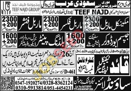 TEEF NAJD GROUP, a prominent private sector entity, is facilitating urgent overseas recruitment for Saudi Arabia. This initiative focuses on securing skilled tradespeople for various positions, including mechanical technician jobs, marble fixer roles, and building painter vacancies. Job seekers with experience in industrial maintenance and construction trades are encouraged to apply for these international career opportunities. The advertisement highlights competitive remuneration packages for qualified candidates seeking employment abroad.