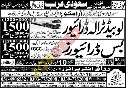 Razzaq Enterprises is facilitating immediate overseas employment for skilled professionals in Saudi Arabia. This recruitment drive focuses on securing experienced Lorry Drivers and Bus Drivers for a prominent Saudi Arabian company. These government-approved vacancies offer a fantastic chance for individuals seeking stable international careers in the transportation sector.