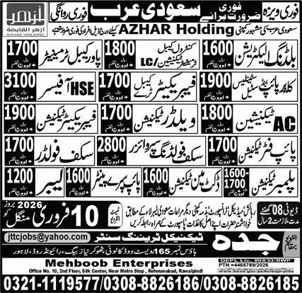 Discover immediate and exciting overseas employment prospects with AZHAR Holding in Saudi Arabia. This advertisement highlights numerous high-demand technical positions, offering a fantastic opportunity for skilled professionals to advance their careers internationally. The company is actively seeking individuals with proven experience in various trades, promising competitive monthly remuneration and the chance to work on significant projects. These roles are ideal for those looking to leverage their expertise in a global market and secure a stable, rewarding career abroad. Explore these latest job openings and take a step towards significant professional growth.