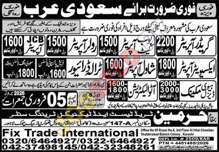 This advertisement highlights urgent overseas employment opportunities in Saudi Arabia, facilitated by Fix Trade International. The focus is on recruiting skilled drivers and technicians for various roles. Job seekers interested in government-approved foreign employment and career advancement in the Kingdom will find these positions highly relevant. The advertisement emphasizes immediate hiring and competitive remuneration for qualified candidates.