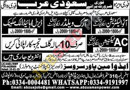 Embark on a rewarding career journey with a leading Saudi Arabian company seeking experienced professionals for immediate deployment. Additionally, Electrician jobs Rawalpindi are available for qualified candidates. This private sector organization offers competitive remuneration and excellent growth prospects for skilled individuals. We are actively recruiting for roles such as AC Technicians, Auto Electricians, and Welders, requiring a minimum of 10 years of relevant experience. If you are a dedicated professional looking for overseas employment opportunities with a reputable firm, this is your chance to secure a high-paying position in the Kingdom of Saudi Arabia. Explore these exciting job openings and advance your career in the Middle East.