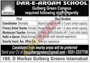 Dar-e-Arqam School, Gulberg Green Campus in Islamabad is actively recruiting for several urgent staff positions. This is a prime opportunity for individuals looking to join a reputable educational institution and contribute to the learning environment. The school is particularly interested in candidates with a strong background in education and relevant experience.