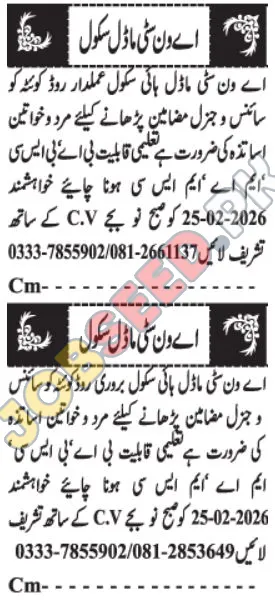A-One Model School, a private educational institution, is hiring for teaching roles. The vacancies are for Science and General Subjects, requiring candidates with a Bachelor's degree and teaching proficiency. This is a great opportunity for educators seeking to advance their careers in a supportive school environment. Discover new job openings and contribute to academic excellence.