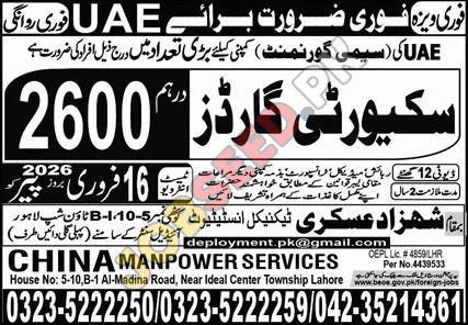 This advertisement highlights urgent overseas employment opportunities for Security Guards in the UAE, with a substantial number of vacancies (2600). China Manpower Services, a private sector recruitment agency, is facilitating this hiring process. The roles require individuals with a strong sense of responsibility and the ability to perform security duties effectively. This is a prime opportunity for individuals looking for international job placements and career advancement in the security sector.