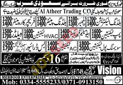 Vision Technical Training Center, Riyadh Saudi Arabia Pakistan invites applications from eligible candidates for the post of Building Electrician, Plumber, Building Painter, Furniture Carpenter, Pump Technician, Aluminum Fabricator, HVAC Technician, Welder, Swimming Pool Technician, AC Technician and Saudi Heavy Transport Bus Driver as per advertisement of 13 December, 2025, published in Express Newspaper. Diploma, Matric educational qualification will be preferred.