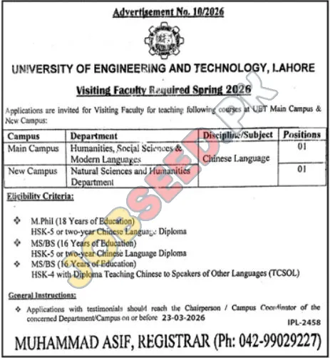 The University of Engineering and Technology (UET), Lahore, a distinguished government institution, is extending an invitation for applications for Visiting Faculty positions. This is a prime opportunity for educators specializing in the Chinese Language to contribute to the academic landscape during the Spring 2026 semester. UET Lahore is committed to fostering a robust learning environment and seeks dedicated professionals to join its esteemed faculty.