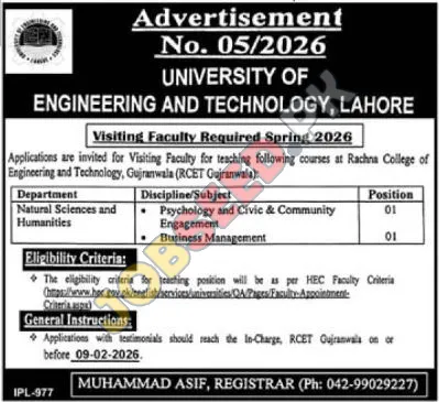 The University of Engineering and Technology (UET) Lahore is offering Visiting Faculty positions for spring 2026. This is an invitation for qualified individuals to teach specific courses at Rachna College of Engineering and Technology (RCET), Gujranwala. This opportunity is ideal for educators aiming for teaching employment or exploring openings for career growth within the academic field, particularly in the public sector.