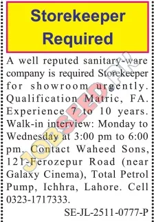 Waheed Sons, Lahore Punjab Pakistan invites applications from eligible candidates for the post of Storekeeper as per advertisement of 24 November, 2025, published in Jang Newspaper. Matric educational qualification will be preferred.