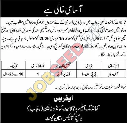 | Job Hiring Organization: | 7 Light Commando Battalion Punjab |