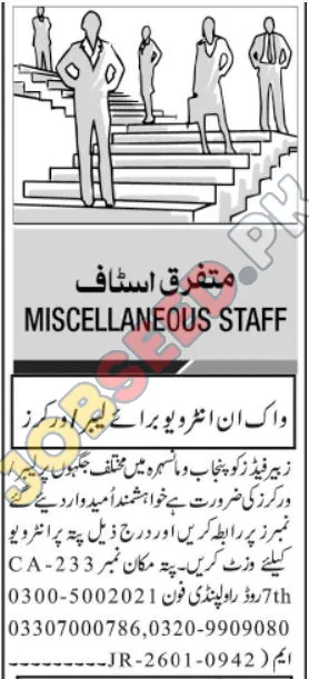 Find the latest labor and worker job vacancies in Punjab and Mansehra. Zairfield is conducting walk-in interviews for miscellaneous staff positions. Apply now for immediate employment opportunities in Rawalpindi and surrounding areas.