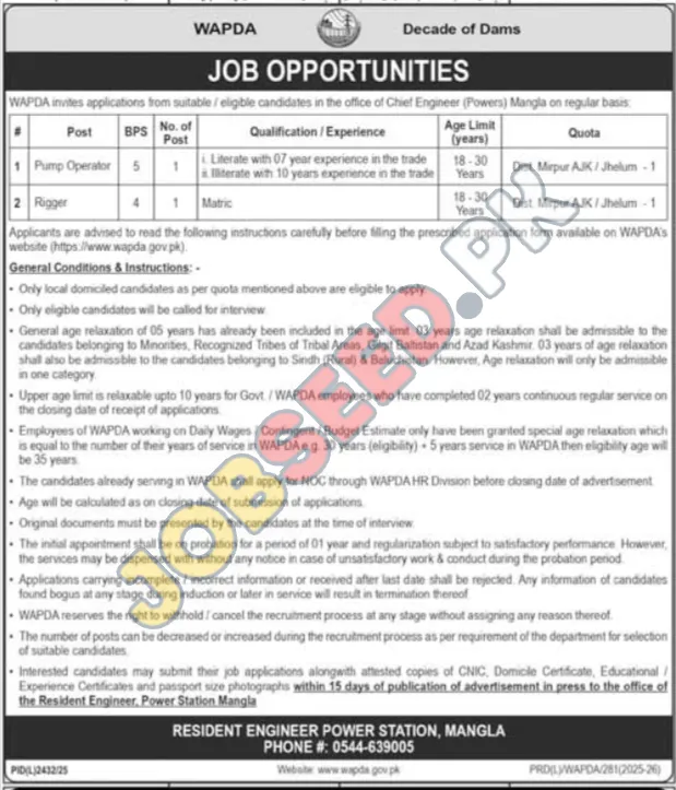 WAPDA Job Opportunities: Pump Operator & Rigger Vacancies in Mangla