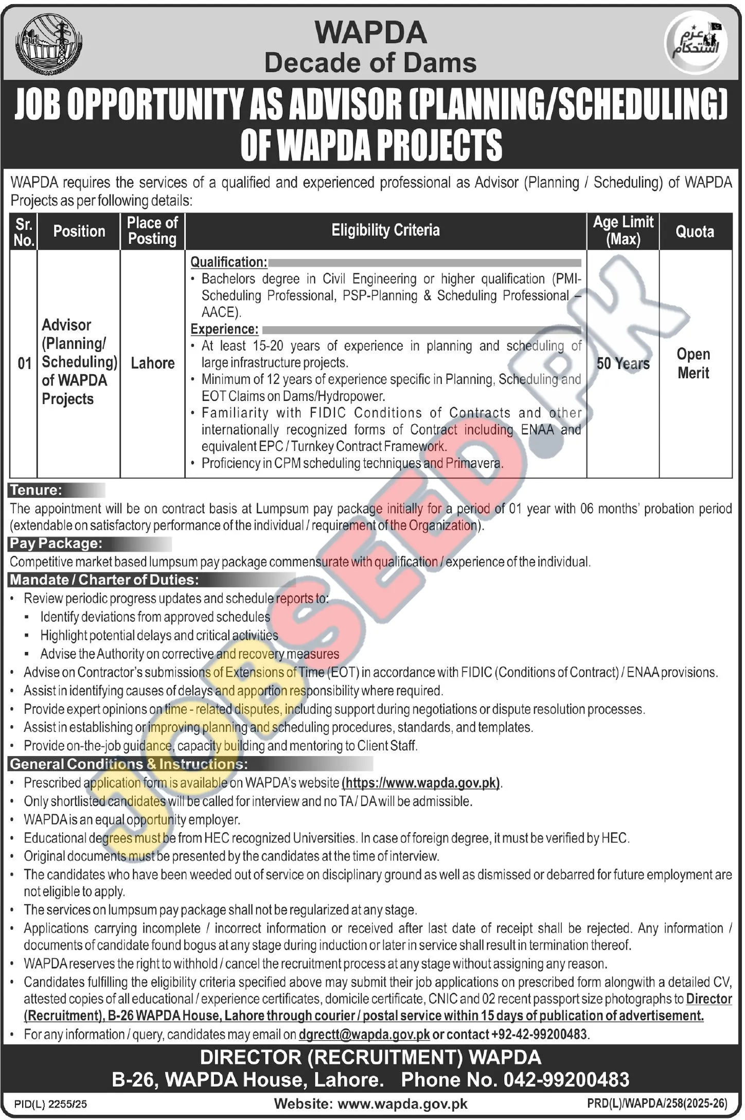 WAPDA Job Opportunity: Advisor (Planning/Scheduling)
