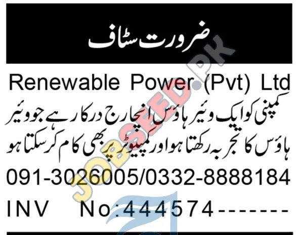 Renewable Power (Pvt) Ltd is currently seeking to expand its team with a dedicated individual for the vital role of Warehouse Incharge. This is a crucial position for applicants who possess practical experience in warehouse management and are proficient in computer operations, ensuring efficient and organized inventory control.
