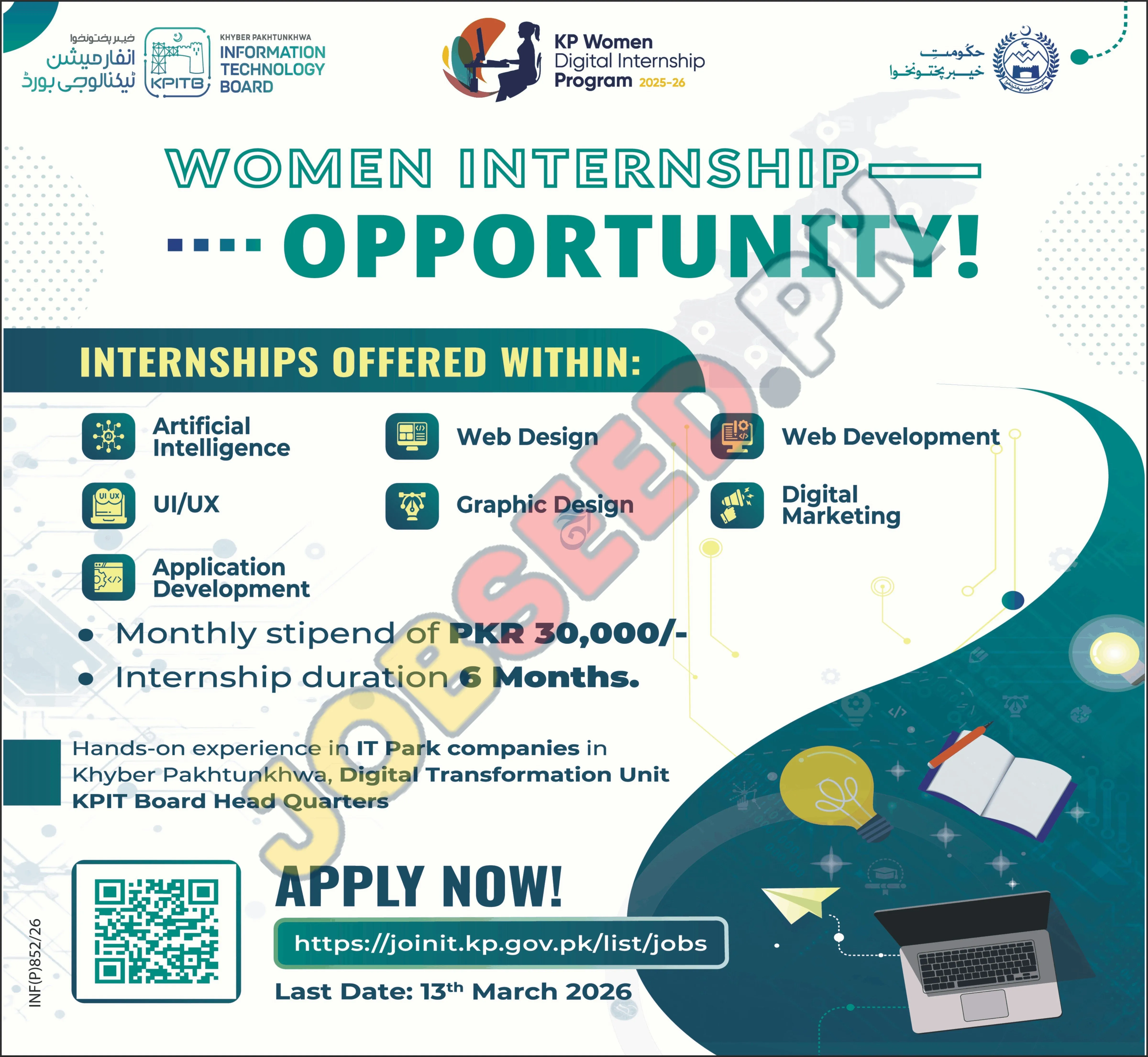 Explore exciting digital internship opportunities for women in Khyber Pakhtunkhwa, Pakistan. This government initiative, spearheaded by KPITB, offers hands-on experience in cutting-edge fields like Artificial Intelligence, Web Design, UI/UX, Application Development, Graphic Design, Web Development, and Digital Marketing. Gain valuable skills and a monthly stipend of PKR 30,000 during this 6-month program. Ideal for aspiring tech professionals seeking to launch their careers in the IT sector.