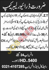 Z.T. Company urgently requires a skilled Driver and dedicated General Labor for various locations including Rawalpindi (Camp No. 11), Wazirabad (Camp No. 3), and Rai Chenab (Camp No. 2, near Mongi Master Tile). If you are seeking a stable job and meet the requirements, we encourage you to apply.